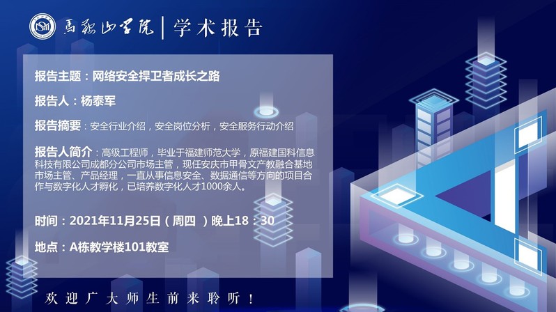 主讲人介绍:高级工程师,毕业于福建师范大学,原福建国科信息科技有限公司成都分公司市场主管,现任安庆市甲骨文产教融合基地市场主管,一直从事信息安全、数据通信等方向的项目合作与数字化人才孵化,已培养数字化人才1000余人。