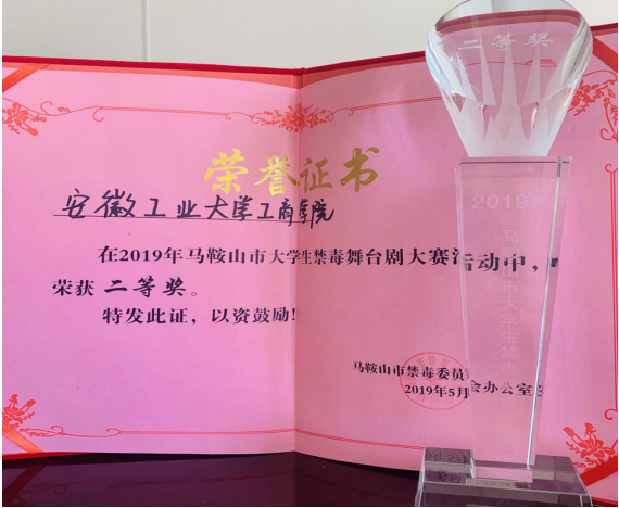 5月18日上午,由马鞍山市禁毒办主办,安徽工业大学承办的“2019年马鞍山市大学生禁毒舞台剧大赛”决赛在安徽工业大学秀山校区大学生活动中心举行,本次大赛的主题为“无毒青春·健康人生”,来自全市各高校的八支队伍参加了比赛,经过激烈的角逐,我院代表队参赛作品《回家》荣获第二名以及最佳编剧奖的佳绩。